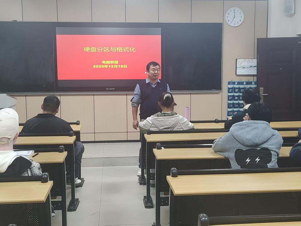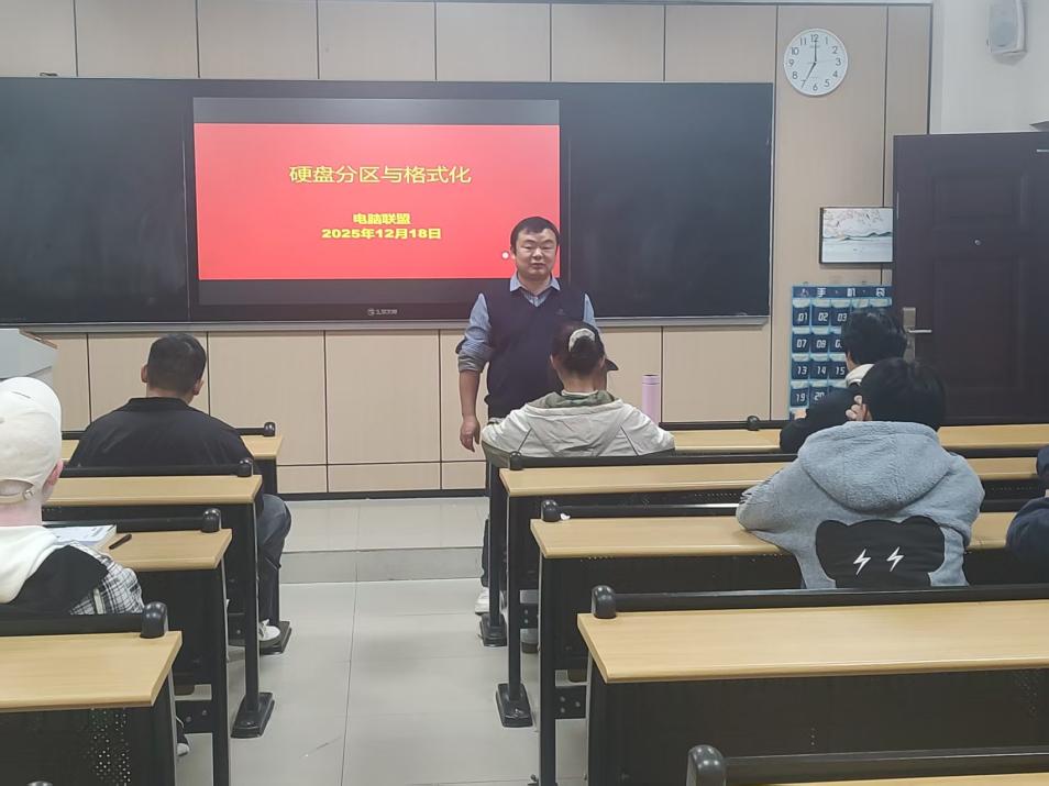 为帮助同学们掌握实用的计算机维护技能,12月18日,电脑联盟社团在明德楼B406开展了以“硬盘分区与格式化”为主题的专题授课活动。本次活动聚焦于解决日常使用中常见的存储问题,包括硬盘分区方法与C盘空间不足的应对办法。