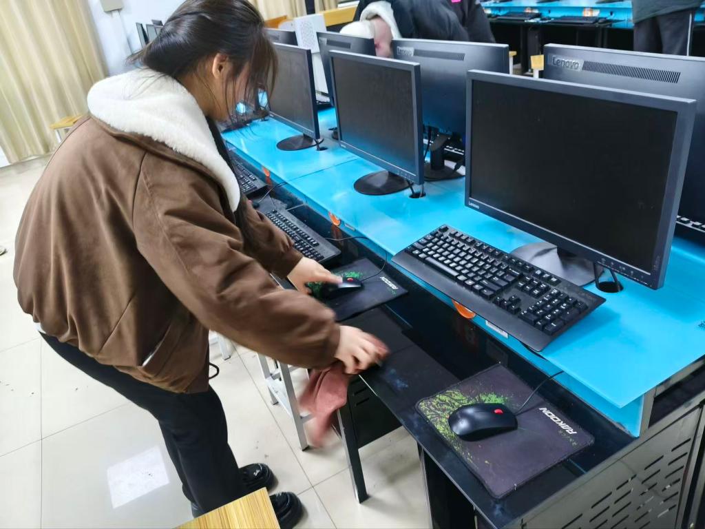 活动现场,志愿者们分工明确、干劲十足。大家手持抹布、扫帚等清洁工具,仔细擦拭电脑桌、机箱表面与地面的灰尘,认真清理键盘缝隙里的杂物,不放过任何卫生死角。针对机房内部分电脑运行卡顿、软件缺失、线路杂乱等问题,信息工程系的技术骨干们发挥专业优势,逐一排查设备故障,重装系统、更新驱动、规整线路,还对机房内的网络设备进行了调试与检查。经过数小时的奋战,机房环境焕然一新,所有电脑均恢复流畅运行状态。