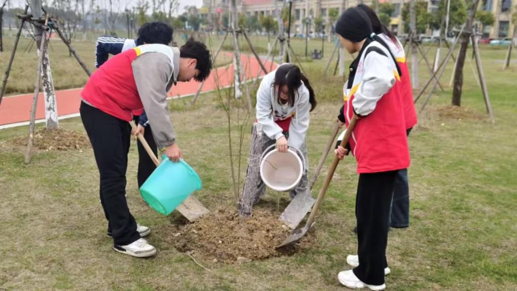 活动伊始,志愿者们准时集合,精神抖擞、热情饱满。在老师的统一安排下,大家迅速分工、默契配合,植树现场一派热火朝天的景象。大家各司其职,有的挥锹挖坑、培土压实,有的扶正树苗、固定枝干,有的提水浇灌、细心呵护。每一个步骤都认真细致,每一道工序都有条不紊。