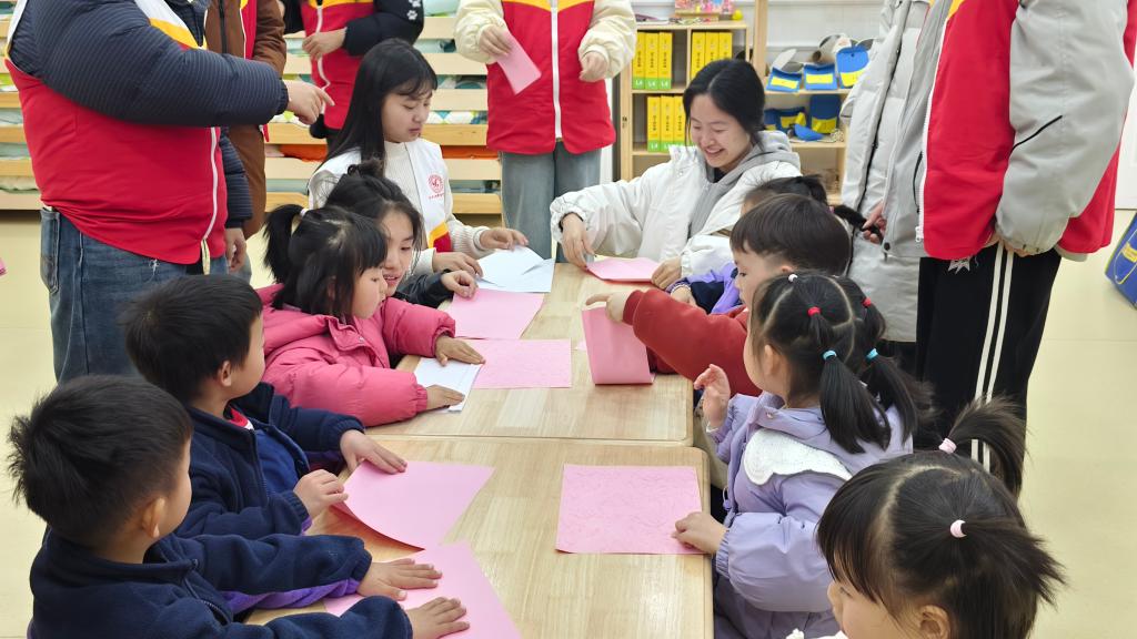 活动中,志愿者带领孩子们开展形式多样的互动体验:大家一起玩老鹰捉小鸡,在奔跑嬉戏中感受集体游戏的快乐;进行趣味折纸教学,志愿者手把手耐心指导,让孩子们在动手实践中收获乐趣与成就感;围坐共读故事书,在温馨的讲述中陪伴孩子们感受文字与故事的魅力。现场欢声笑语不断,秩序安全组全程守护,确保活动安全有序,宣传部用心定格每一个温暖瞬间。
