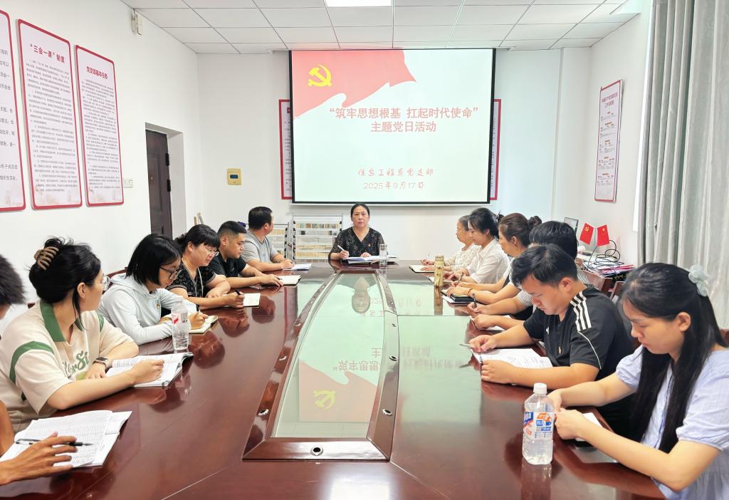 为深入学习贯彻习近平新时代中国特色社会主义思想,强化党员教师的思想理论武装,9月17日,信息工程系党支部组织全体党员在党员活动室开展了"筑牢思想根基扛起时代使命"主题党日活动,活动由党支部书记主持。