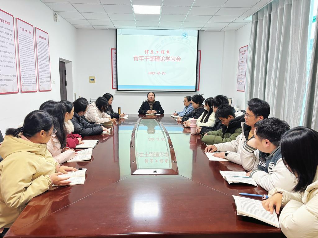 12月24日,信息工程系组织年轻干部在党员活动室召开了青年干部理论学习会,会议由党支部书记主持。