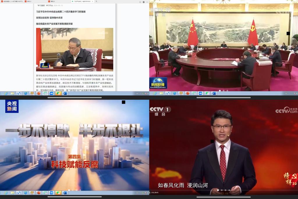 活动中,党支部书记首先传达了习近平总书记在二十届中共中央政治局第二十四次集体学习时发表的重要讲话精神。随后,全体党员共同学习了《习近平谈治国理政》第五卷中“扎实推进‘一国两制’实践和祖国统一大业”与“开创中国特色大国外交新局面”两个专题的重要内容,进一步深化了对国家大政方针和外交战略的理解。为加强警示教育,支部组织集中收看了电视专题片《一步不停歇 半步不退让》第四集《科技赋能反腐》,以及中央广播电视总台制作的专题节目《榜样10》,从正反两方面引导党员筑牢思想防线、汲取奋进力量。会议还再次传达了上级党组织《关于做好2026年春节期间正风肃纪工作的提示》,对节日期间的廉洁纪律提出了明确要求。