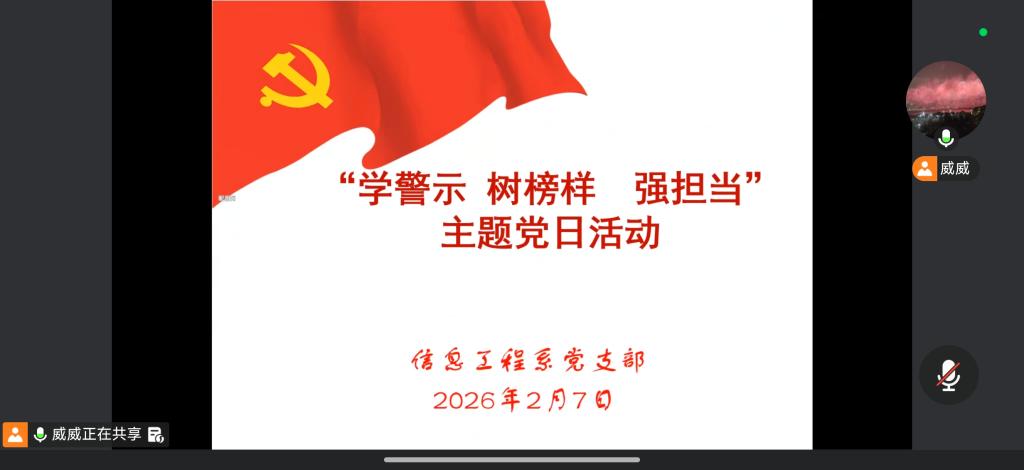 为强化党员纪律意识,弘扬榜样精神,切实提升支部党员的政治担当和履职能力,2月7日,信息工程系党支部通过腾讯会议线上平台,组织开展了“学警示 树榜样 强担当”主题党日活动。