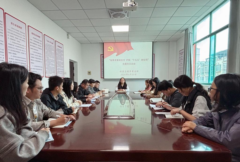 为深入学习贯彻总体国家安全观,增强党员教师统筹发展与安全的意识和能力,4月22日,信息工程系党支部组织全体党员在党员活动室开展了“统筹发展和安全,护航‘十五五’新征程”主题党日活动。活动由党支部书记主持。